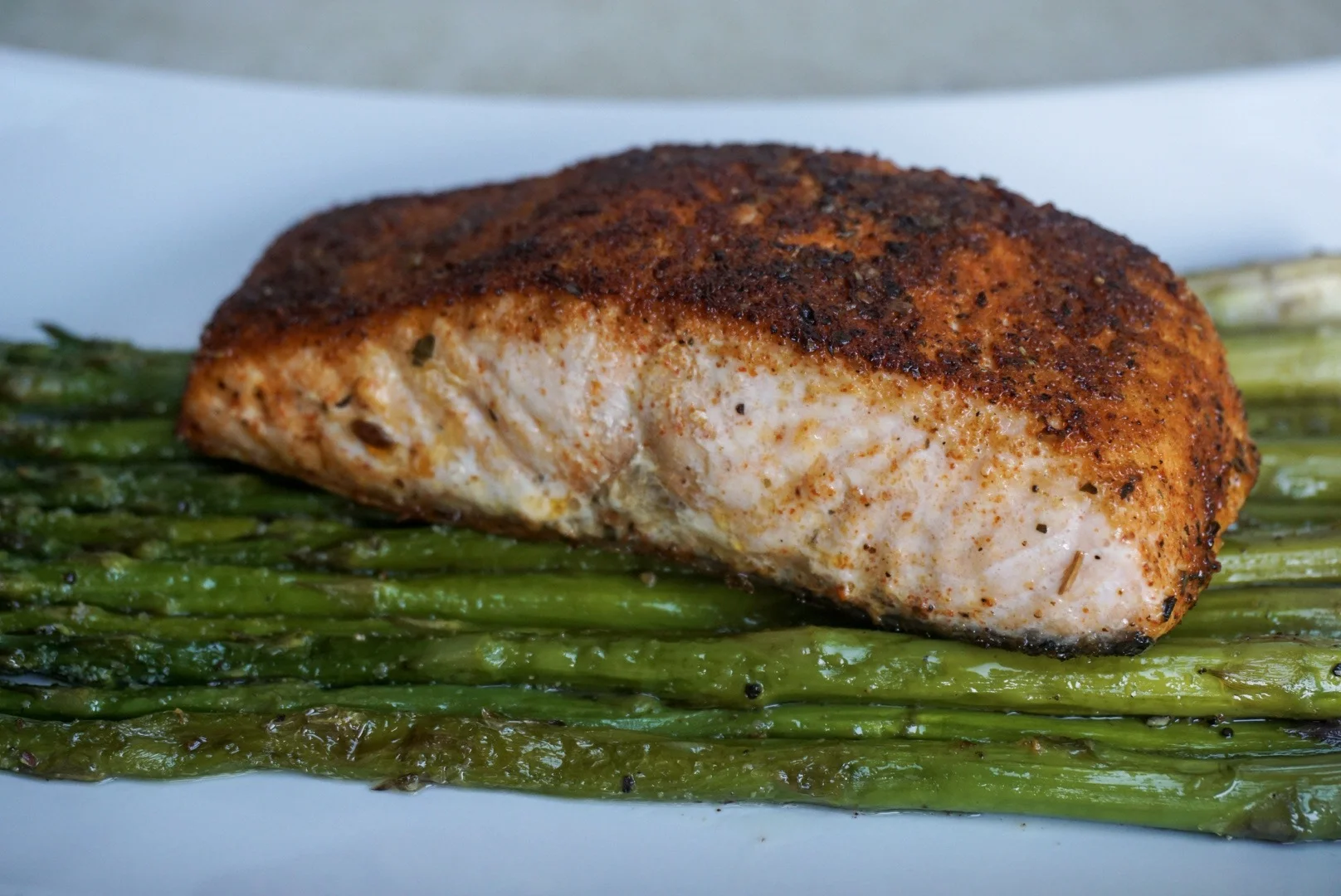Preheat your oven to 400 and begin to heat your cast iron pan over medium-high heat. while the stove and oven warm, prep your salmon. Using a paper towel, pat dry the salmon (so the seasoning will stick). Season the salmon with the blackening seasoning, rubbing it into the fish as you go. Once your cast iron pan is hot, drizzle with olive oil and place fish seasoned side down into the pan. Cook for about 2 minutes, or until you have a nice crust on the salmon. Flip the fish over, and move the cast To the oven. Bake until fish is throughly cooked, but not over cooked (salmon is over cooked when it starts to turn white on the sides). Depending how thick your piece of salmon is, this could take anywhere from 8-12 minutes. serve warm. Enjoy!